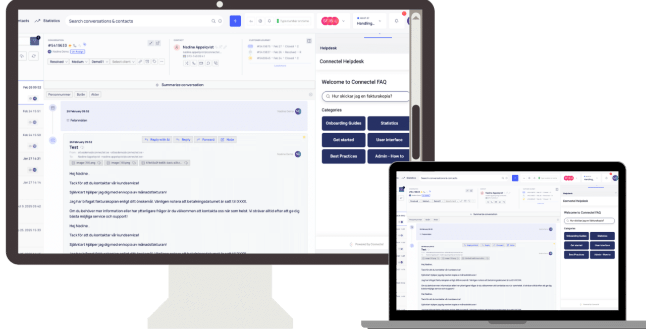 Connectel develops a software platform for customer service. The platform can collect all customer communications in one place and makes it easy to offer the service customers expect from your company. We simplify everyday life for the customer service department, regardless of the channel and wherever you or your customers are. Read more about why we do what we do here.